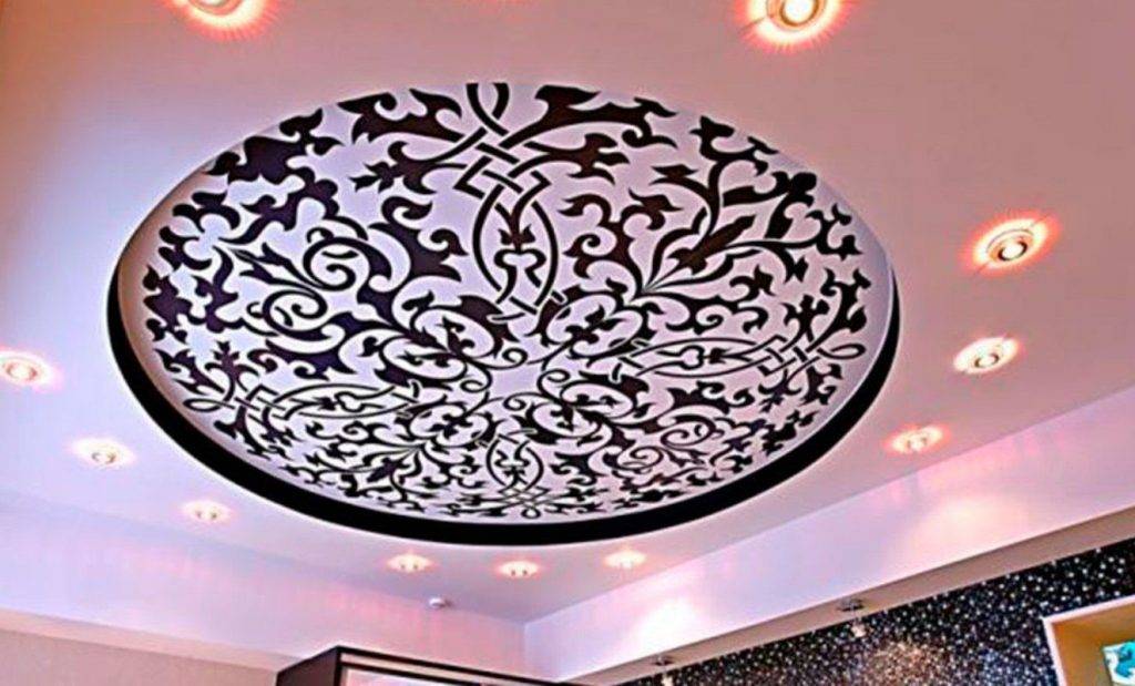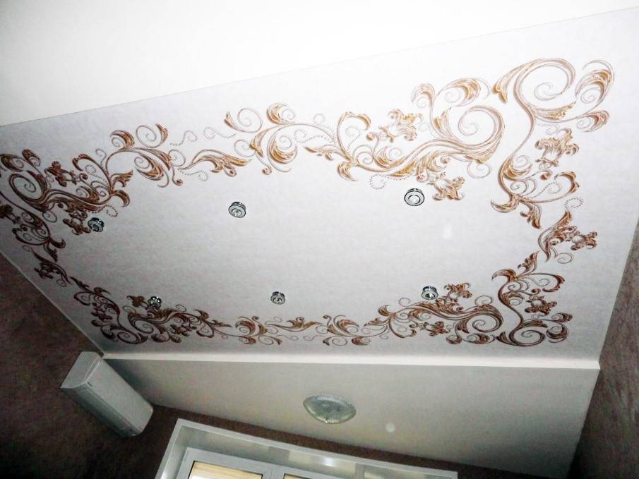 Такие потолки украшаются не только росписью или нанесением изображения, например, с помощью фотопечати, но их можно оформить с помощью кристаллов или светильников.