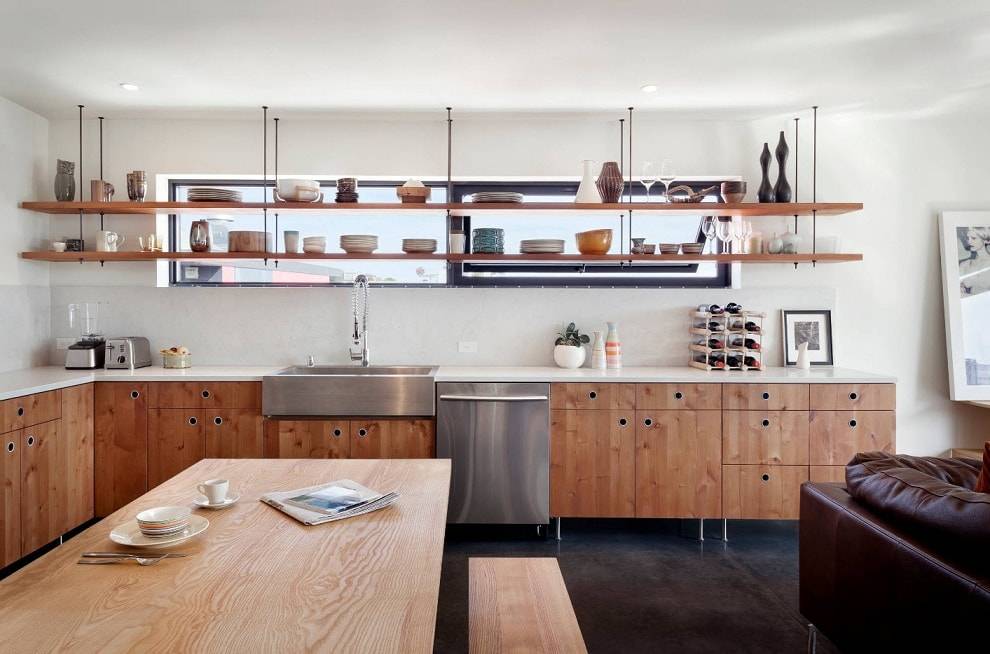 Если на кухне в качестве материала для полок используется натуральная древесина, её поверхность должна быть надежно защищена средством, устойчивым к влаге и перепаду температур