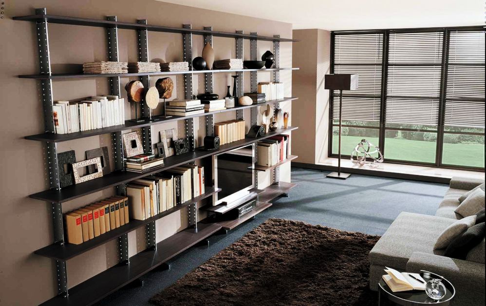 Настенные книжные конструкции наиболее популярны. В зависимости от оформления комнаты можно выбрать навесную полку для книг классической формы или предпочесть современную модель. При ограниченном пространстве уместны будут полки-башни, способные гармонично вписаться в любую комнату.