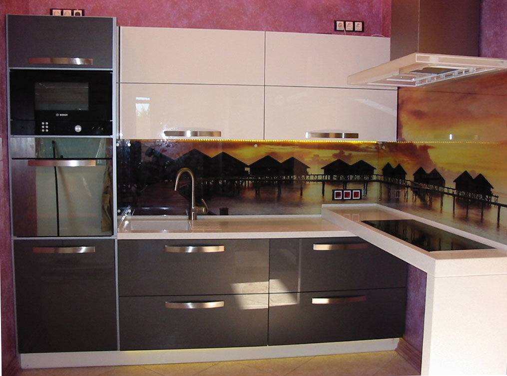 - Глянцевые фасады — особенно подходят для стилей хай-тек и модерн. Чаще всего применяются при изготовлении кухонной мебели. Цветовые глянцевые решения могут быть любыми — с эффектом «хамелеона», «металлик», градиентами.