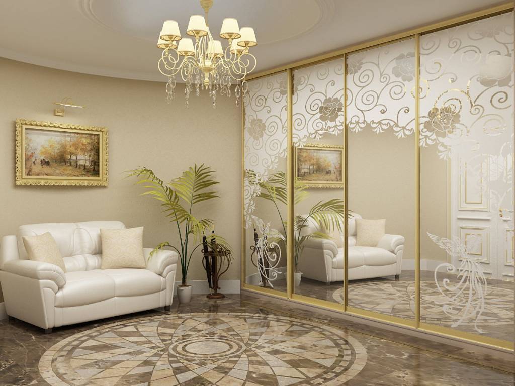 - Зеркала — при правильном использовании визуально расширяют пространство. Могут быть использованы сами по себе или как основа для матирования, лазерной гравировки, шелкографии, художественной росписи — эстетическая привлекательность таких изделий велика.
