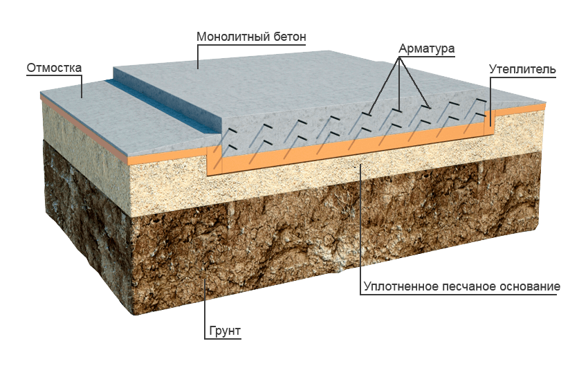 Железобетонная монолитная плита — выбирается в основном на сложных грунтах, на глинистой, торфяной почве или с большой глубиной промерзания. Основное преимущество устройства такого фундамента в том, что плита является сплошным основанием, способным выдерживать большие нагрузки и сохранять целостность строения;