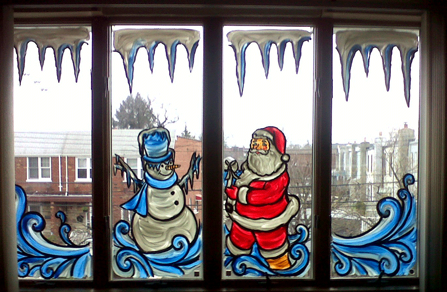 Окно будет выглядеть очень красиво, если украсить его разнообразными силуэтами сказочных зверей, снеговиков, Санта Клауса, елки и многого другого, достаточно пофантазировать и немного потрудиться.