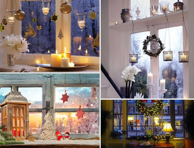 Среди прочих возможных вариантов оформления – свечи, веночки, елочные игрушки, веточки настоящей ели, фонарики и многое другое. Если у вас достаточно просторный подоконник, можете совместить несколько идей.