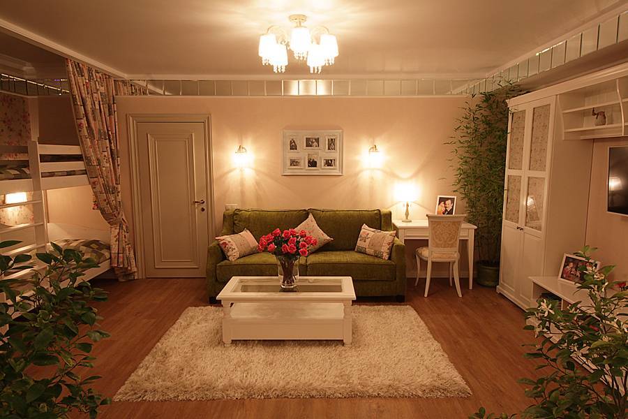В первую очередь позаботьтесь об одном напольном покрытии — оно поможет соединить вместе все функциональные зоны. Выбирайте универсальные, устойчивые к влаге материалы, если вы планируете оборудовать на территории кухню. Рассмотрите ламинат или керамогранит — эта плитка точно имитирует натуральное дерево, паркет, камень и другие материалы.