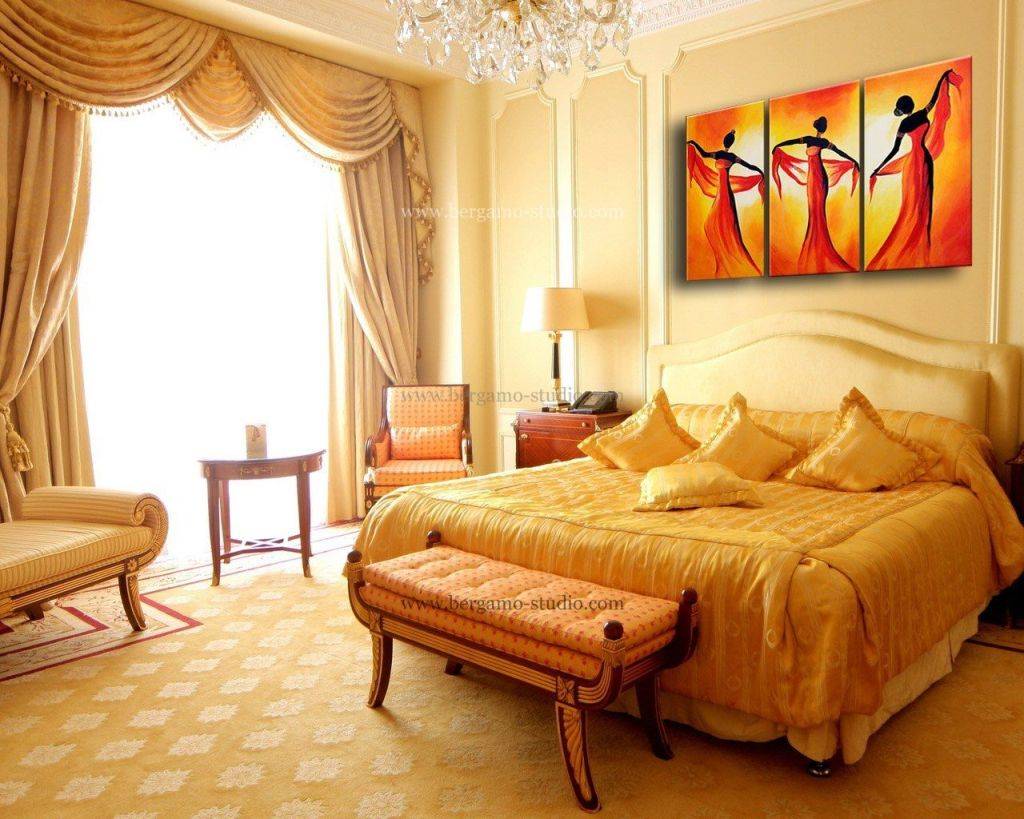 Для любителей роскоши и классического интерьера как никогда лучше выбрать золото для оформления стен. Да, цвет специфический и вызывающий, поэтому подойдет далеко не каждому. Также это не самый лучший вариант для маленьких помещений, а вот в больших спальнях это будет вполне уместно, даже если таким обоям выделить одну какую-то стену для создания контрастного эффекта.