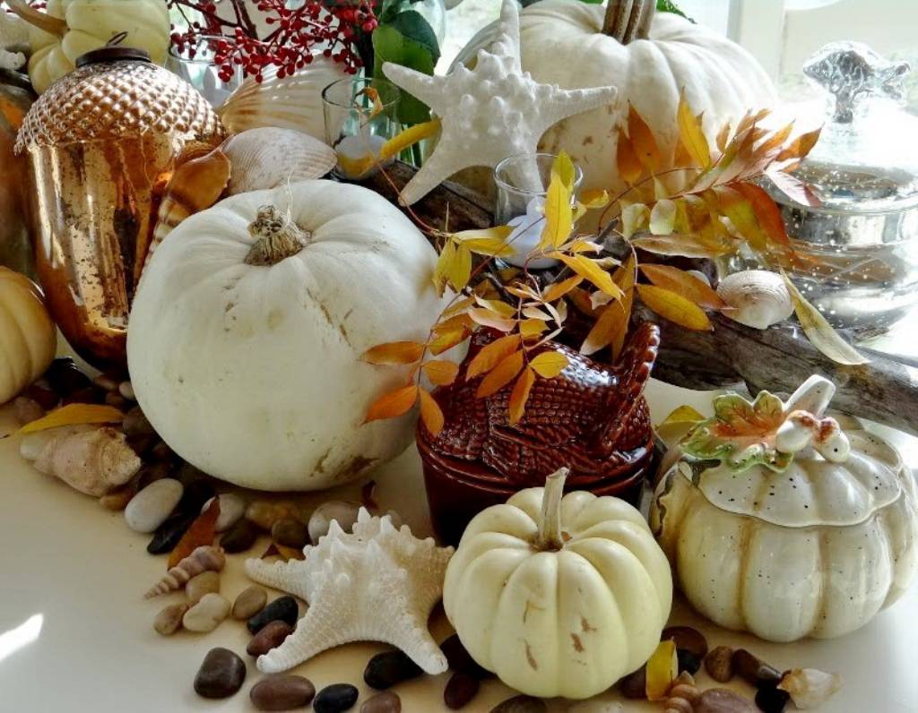 Подсвечники из декоративных тыковок, выкрашенные в белый цвет акриловыми красками, уместны в качестве декоративных элементов при любом сезоне. По желанию цвет раскраски можно сменить, наполняя пространство яркими пятнами акцентов. От этих манипуляций осенний декор, фото которого представлены ниже, только выигрывает: