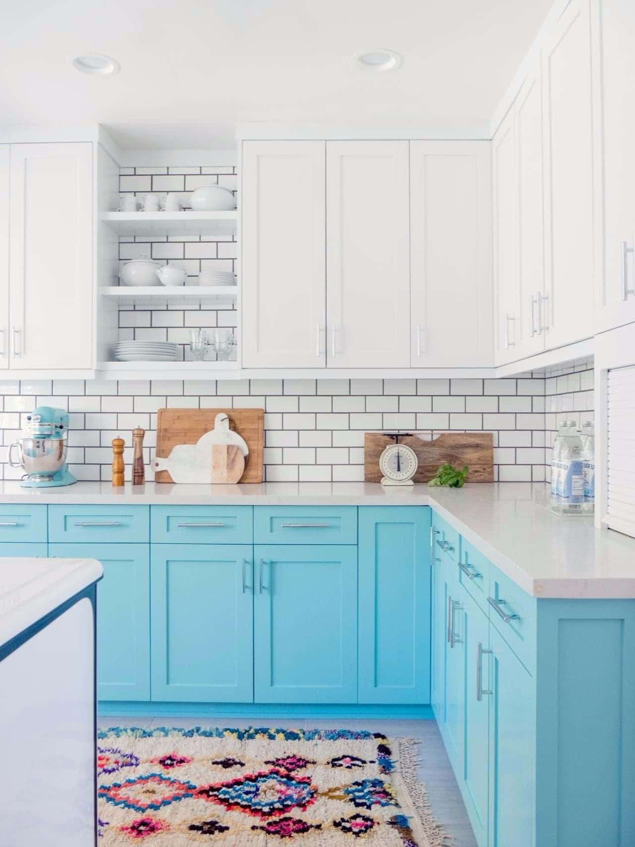 Светло-голубой, почти прозрачный холодноватый фон стен превосходно подходит для миниатюрной кухни. Гармонично впишутся в такой интерьер однотонные аквамариновые легкие занавески, ярко-зеленый фартук, светло-коричневый пол, белые фасады мебели.
