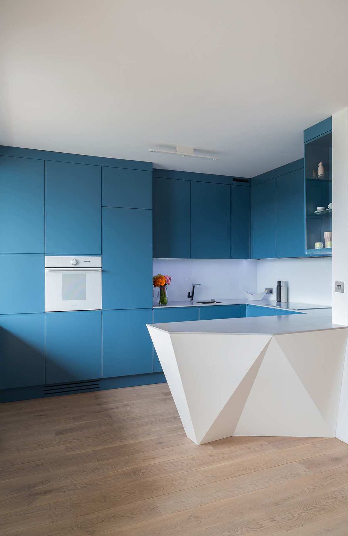 - Угловой вариант с полуостровом, когда с одной из сторон делается небольшой выступ. Он может использоваться как для хранения или приготовления еды, так и в качестве зоны отдыха. Например, там ставится стойка и барные стулья, чтобы можно было перекусить или выпить кофе утром. Нередко на полуостров выносят раковину или электрическую плиту с духовым шкафом.