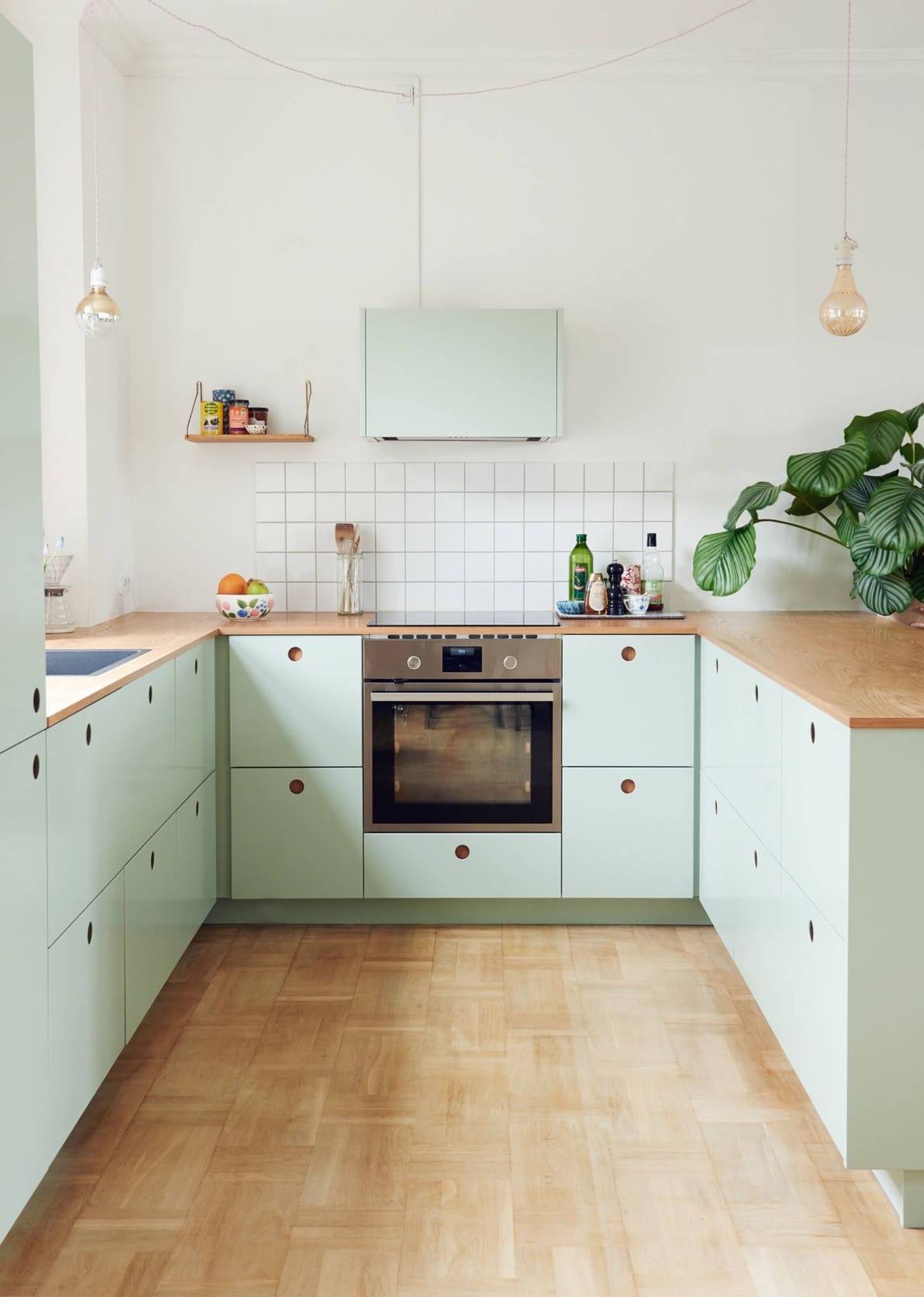 Привнесет в кухонное помещение свежесть — зеленый пастельный цвет. Интересное сочетание получается при добавлении желтых декоративных элементов и прочего внутреннего убранства.