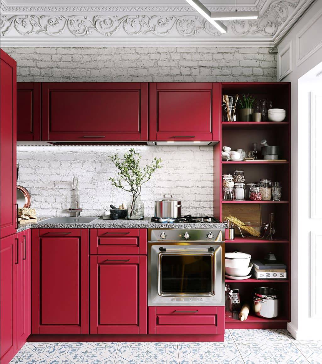 Приглушенный сильно разбавленный красный тон целесообразно использовать для мебели, фартука или акцентной стены. Основной фон должен быть светлым, практически белым.