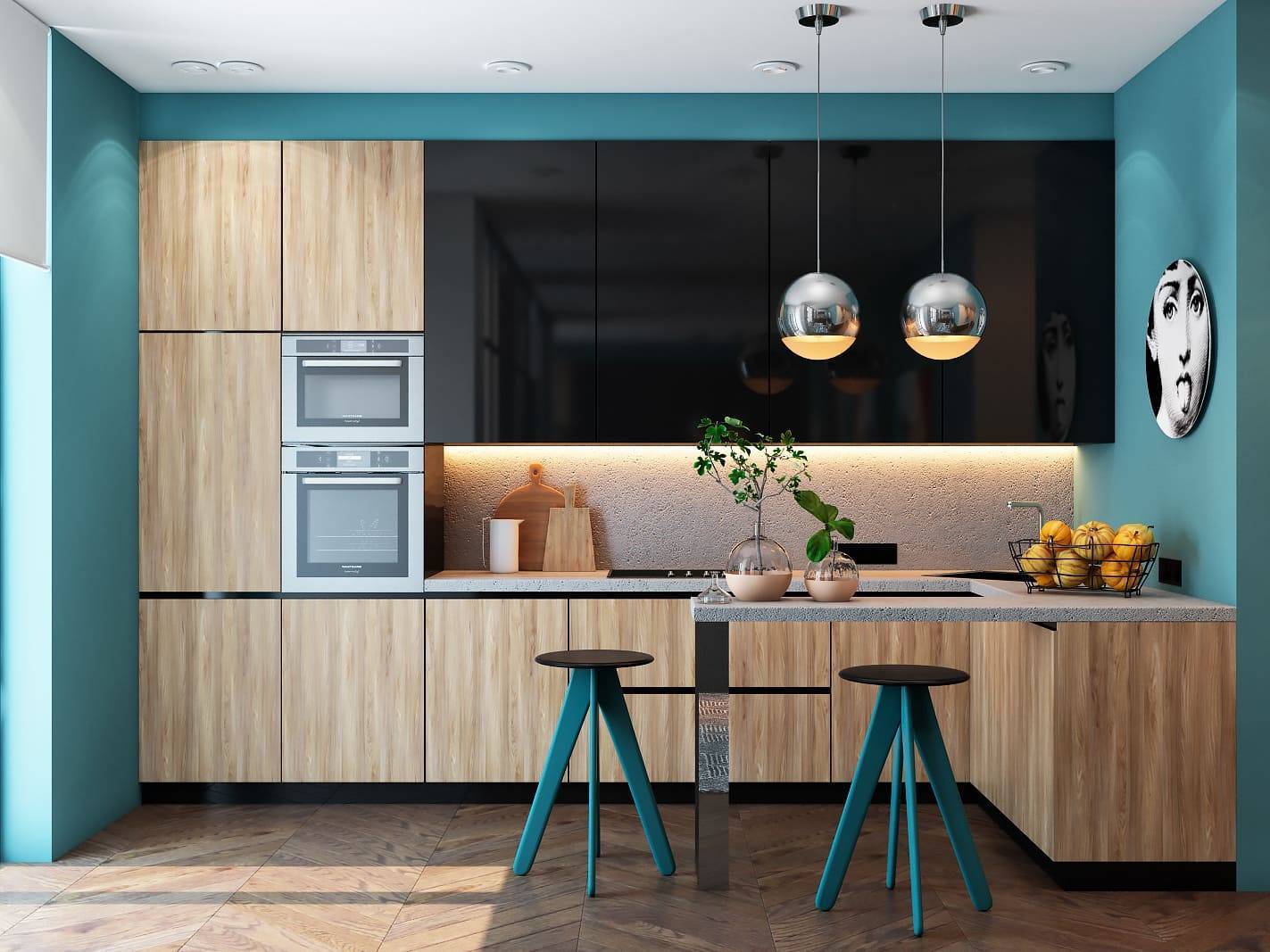 - Угловая кухня с барной стойкой. В этом случае совмещаются обеденная и рабочая зоны, чаще всего они имеют разную высоту, но при этом выполнены в едином стиле. Очень удобно, если на одной из стен расположено большое окно или же когда перегородка между балконом и кухней частично демонтируется.
