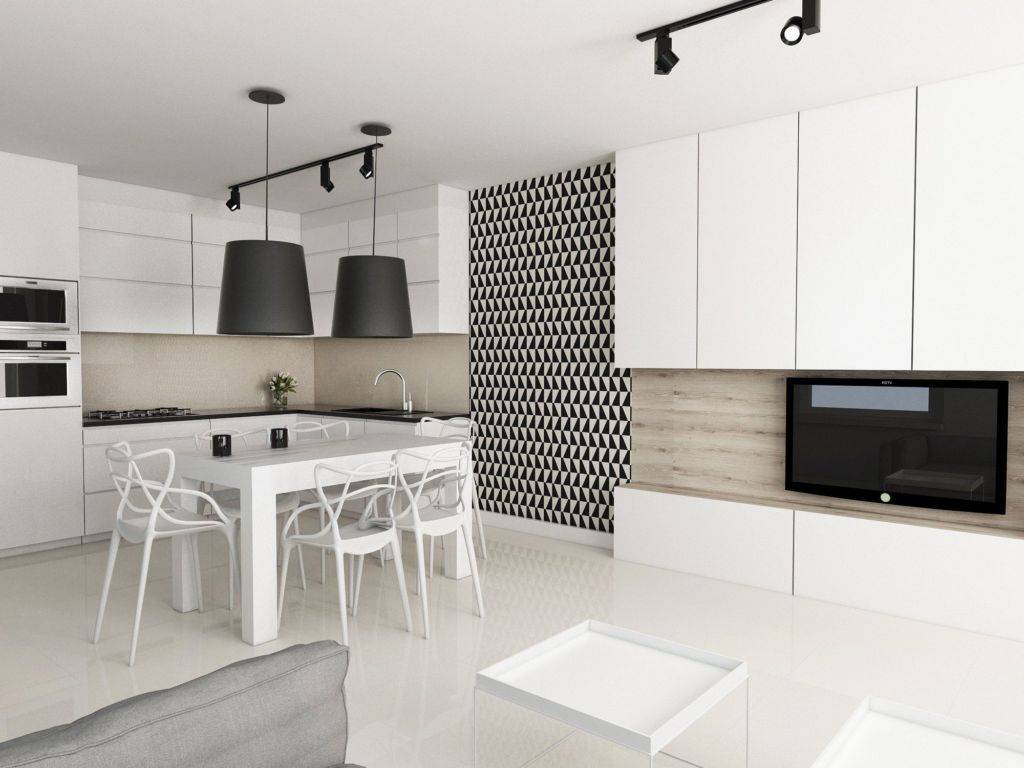 - Обои в зоне отдыха могут содержать рисунок, соответствующий выбранному стилю. А стены в кухне могут быть однотонными. Гостиная обычно окрашивается в более мягкие тона, поэтому белыми могут быть только обои и детали, а пол и мебель лучше выбрать в теплых оттенках или в цвет столешницы на кухне.