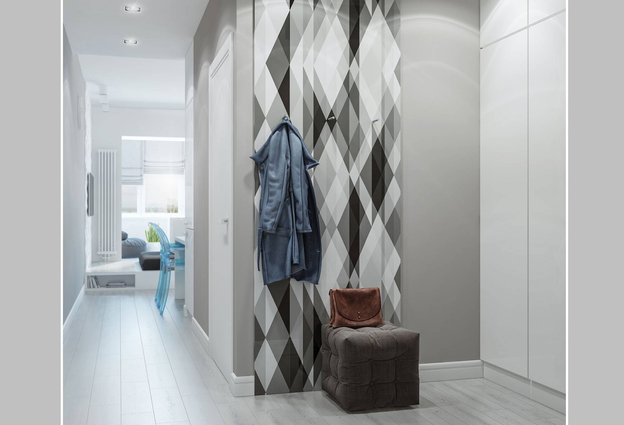 Рисунок на обоях гармонично переходит в бело-серые разводы. Светлая прихожая кажется очень просторной и легкой.