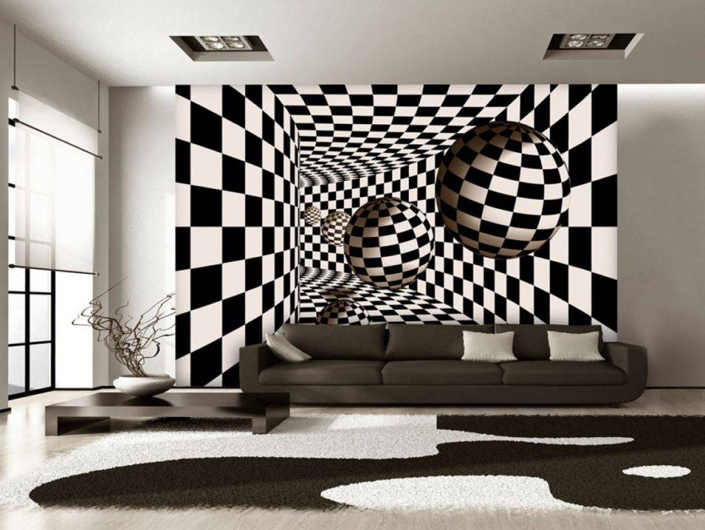 Эффект изменения пространства или тромплёй получают, используя геометрические линии. Например, полосы расположенные по высоте стены делают потолок выше. Данную иллюзию получают если использовать не только изображения, но и вытянутые конструкции в виде панелей, молдингов.