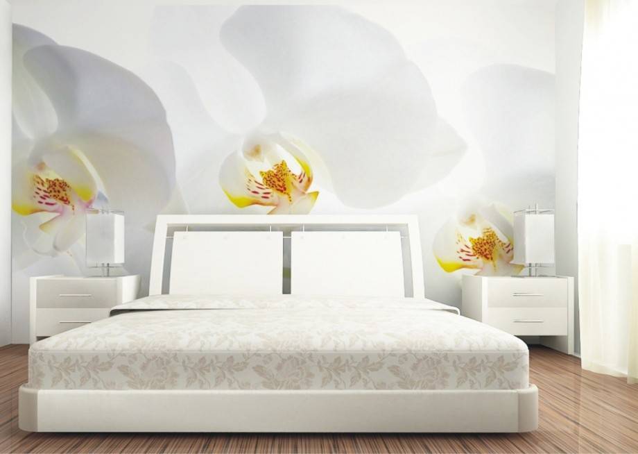 В просторных помещениях интересно будут смотреться обои с макро рисунками. Большие цветы в стиле акварель украшающие одну из стен станут изюминкой вашего интерьера.