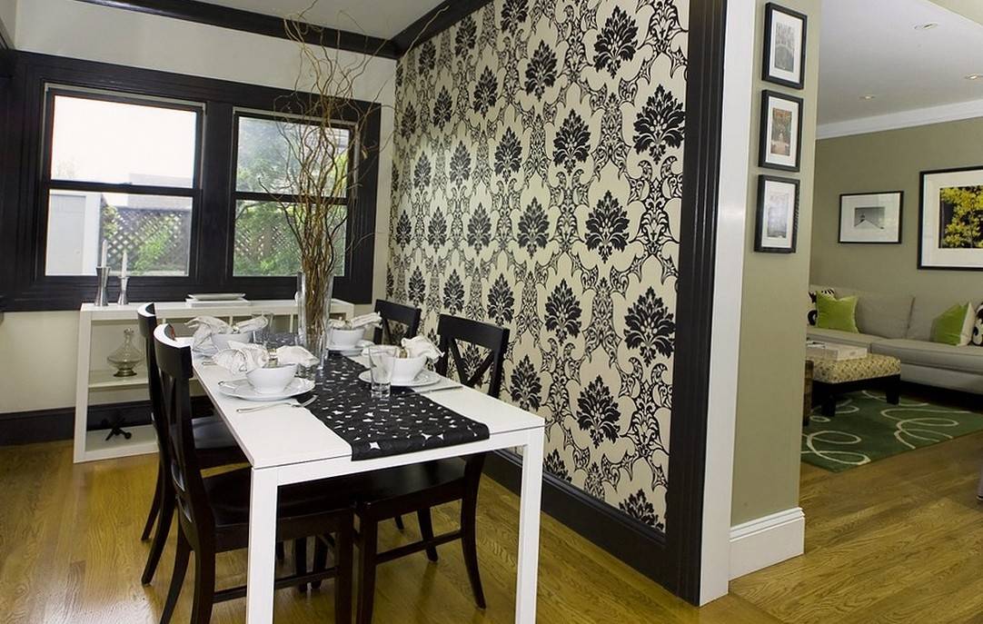 Совет: с помощью обоев с имитацией можно выделить стену у обеденного стола: выполненные даже в нейтральных цветах, такие обои создадут изысканный акцент.