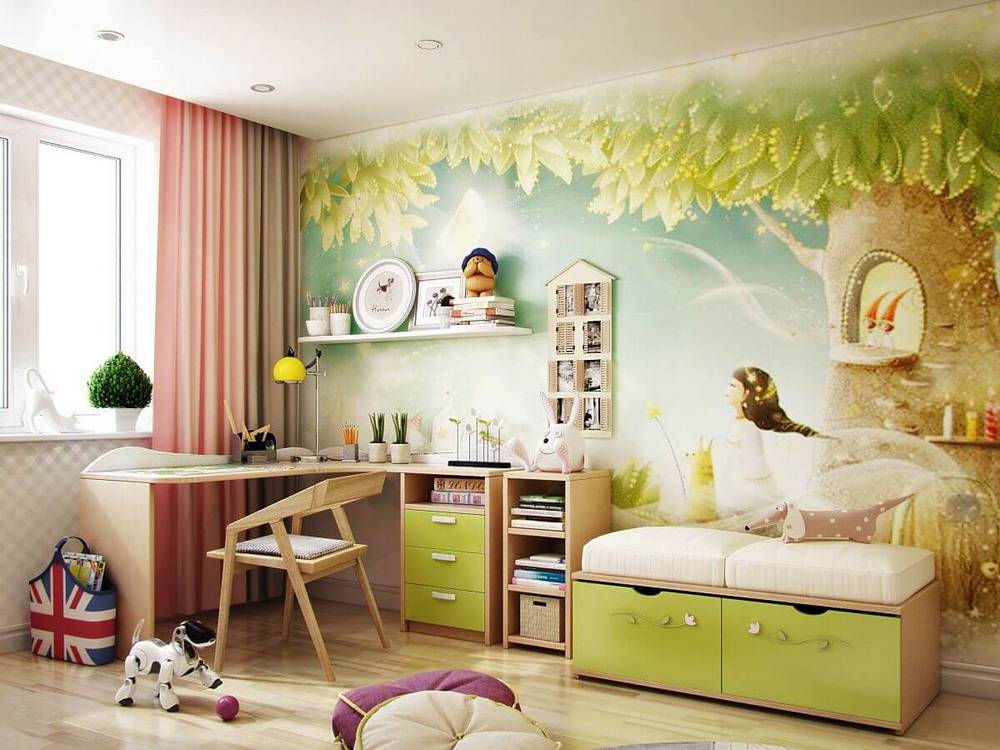 - Очень красиво будет выглядеть одна стена с фотообоями либо обоями с детским рисунком на фоне монохромных обоев.