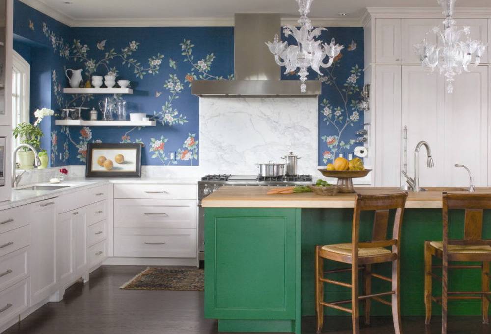 Если вы счастливый обладатель большой кухни с высокими потолками и большими оконными проемами, то здесь есть, где развернуться. Чтобы комната стала уютной и семейной помещение делят по горизонтали на две равные части. Верх должен быть светлого цвета, низ – темного. А между обоями контрастная граница. Этот метод зрительно немного опустит потолок.