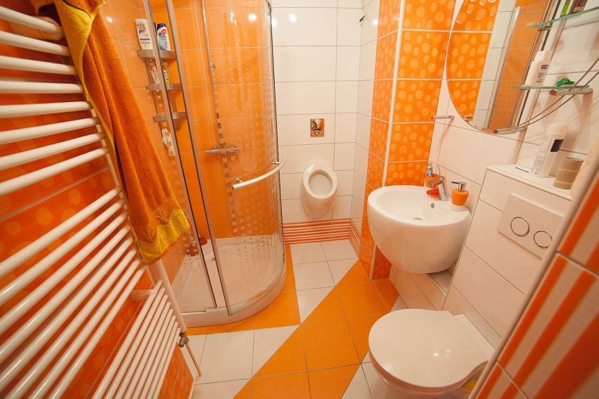 Для комнат средних и больших размеров подойдут желтые и оранжевые цвета, которые привнесут энергию и свет (в маленькой ванной можно ограничиться яркими предметами на фоне пастельных стен).