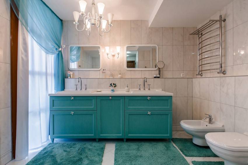 Свою лепту в насыщение интерьера дополнительными цветовыми акцентами может внести установка корзин для белья, расположение цветных полотенец. Если ванна в загородном доме имеет естественное освещение, на окна вешаются цветные занавески. На полу укладывают яркие коврики.