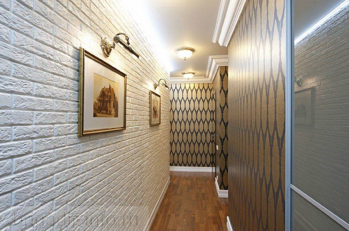 - Виниловые. Самый оптимальный вариант для отделки коридора, они хорошо моются, устойчивы к свету, просты в уходе, хорошо защищают стены, скрывают неровности поверхностей, имитируя рельеф кирпича;