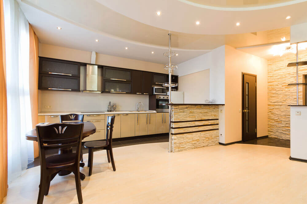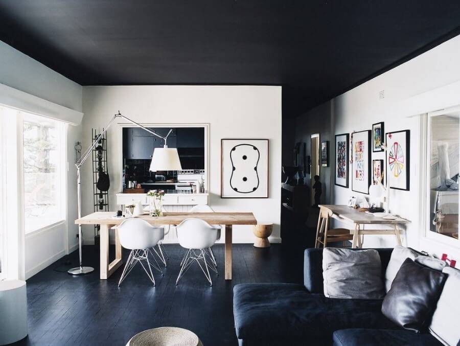 Синий потолок в кухне станет ее изюминкой. Для кухни маленькой площади подойдет светло-синий оттенок, он будет гармонично смотреться со светлым оформлением. Для гостиной объединенной с кухней позволительно использование темных оттенков, потолок может объединять два пространства, а разный способ освещения обозначит зоны.