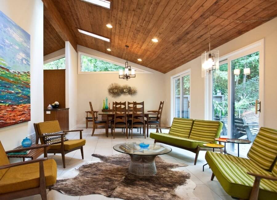 Сочетание цвета обоев потолка и предметов интерьера играет основную роль.