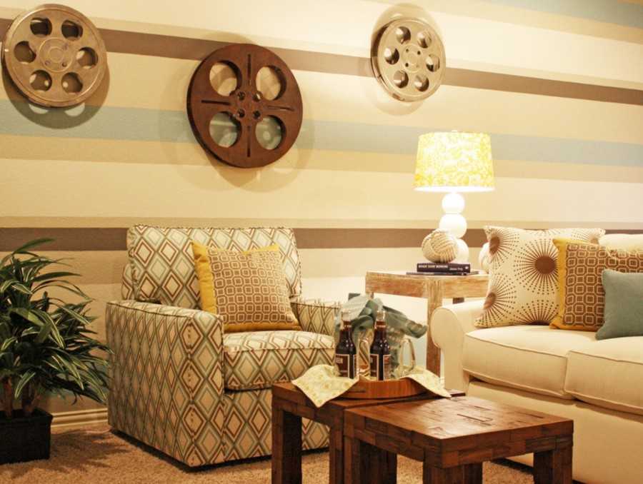 Очень красиво и эффектно выглядят полосы. К примеру, можно сделать одну горизонтальную, проходящую через все помещение (комнату) или же много вертикальных и нешироких полосочек. Да, конечно такая работа достаточно трудоемкая и кропотливая, но зато результат ошеломляющий!