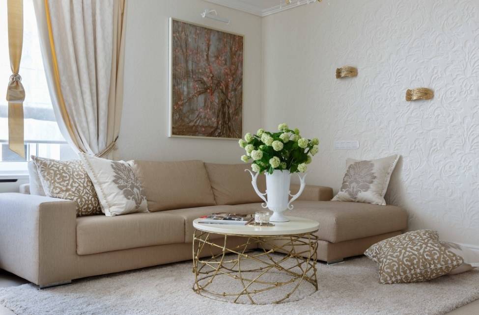 Нейтральные обои в гостиной с низкими потолками