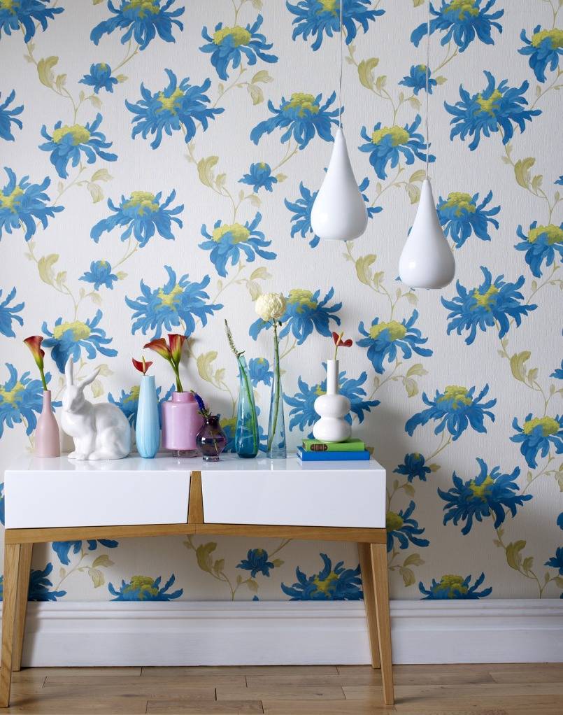 нежно, по-весеннему красиво и свежо в дизайне воспринимаются обои с голубыми цветами. Голубой оттенок можно скомбинировать и с темной, и со светлой палитрой;
