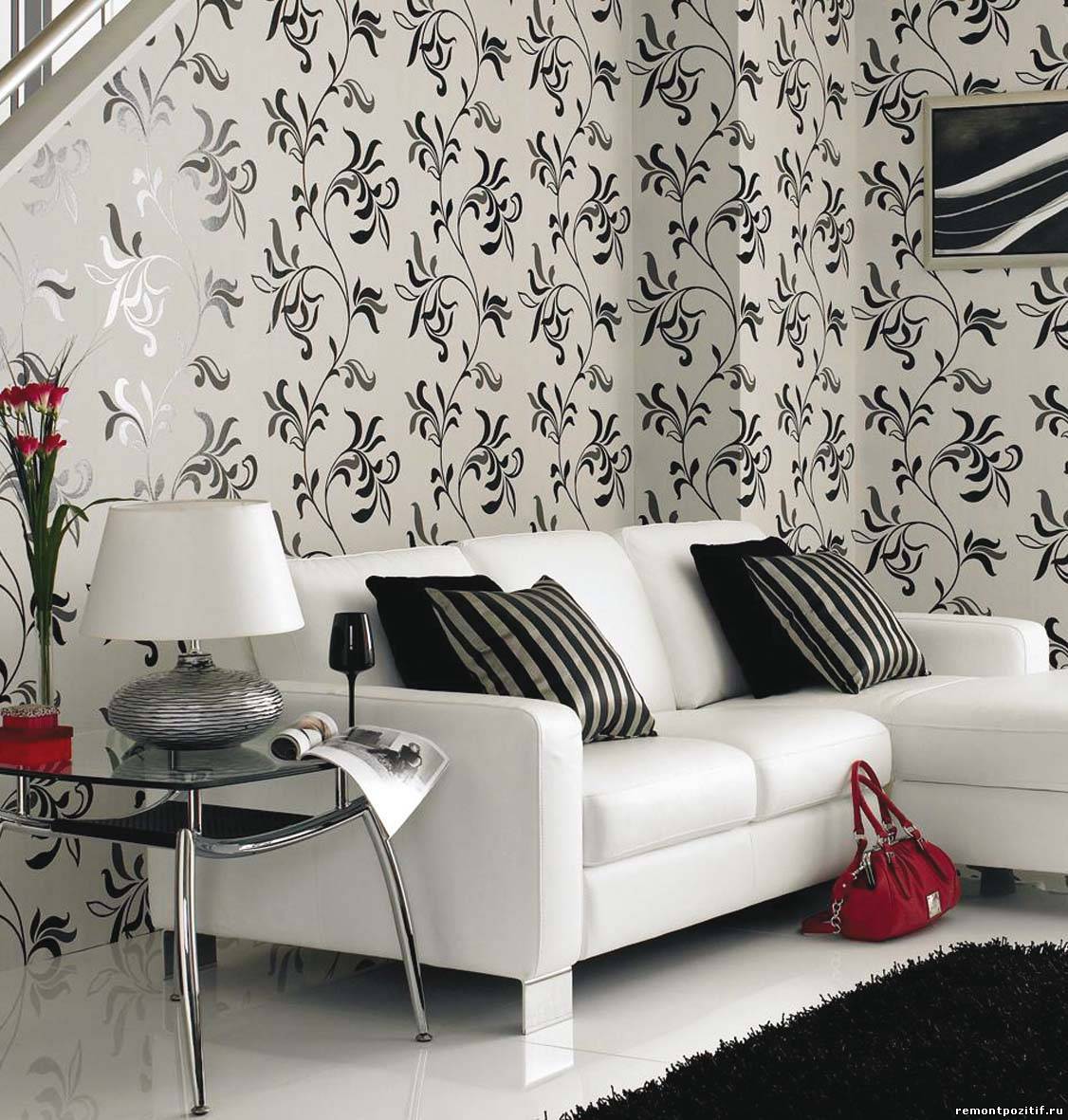 Белые обои в интерьере гостиной