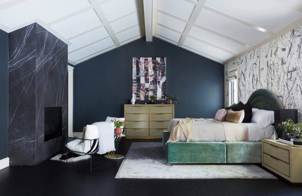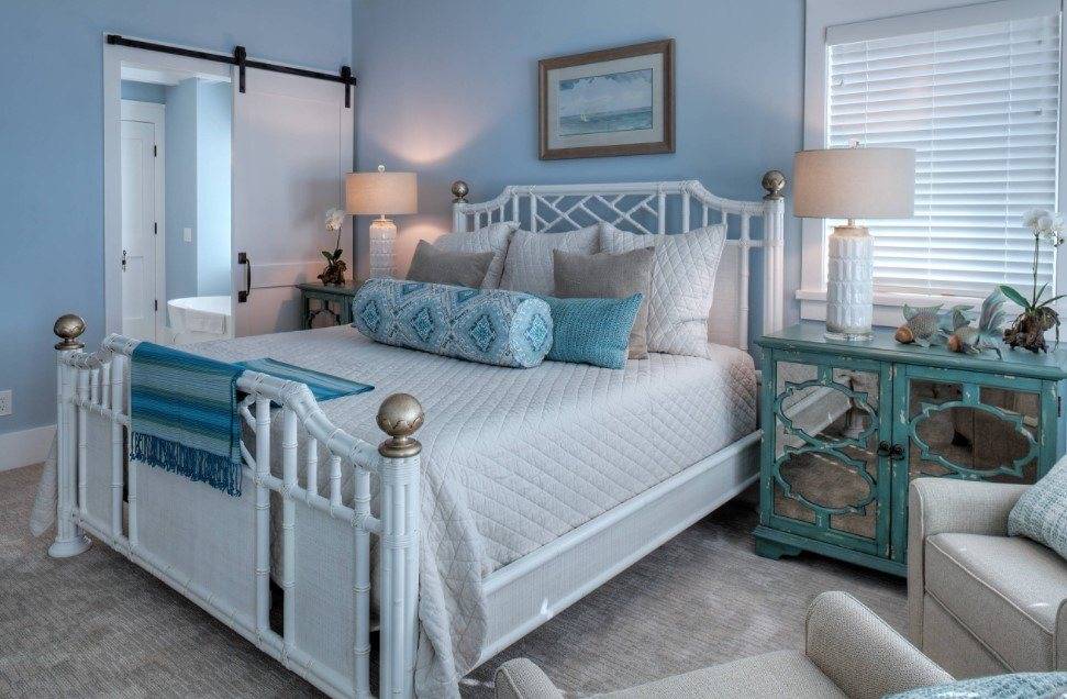 Многогранные оттенки синего, к примеру, бирюза, сапфир или синий с серым отливом, создадут в спальне некое ощущение морской свежести.