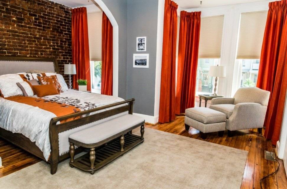 Оформление интерьера с яркими вкраплениями подразумевает присутствие в помещении броских и контрастных акцентов в виде прикроватного коврика, штор, декоративных подушек, рамок для фотографий либо светильника.