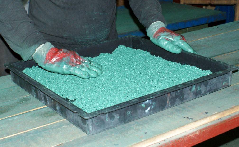 Резиновая крошка – это основное сырье для производства плитки. Данное сырье производиться в результате переработки покрышек любого размера путем измельчения на мелкие фракции. Резина отправляется на фрезы измельчителя, которые разрывают ее на мелкие части, после чего она проходит много степеней очистки от других не резиновых частиц. Например, металлической проволоки корта шины, пыли и другого мусора. Очищенное сырье взвешивают в мешках и готовят к отправке в цех по производству плитки из резиновой крошки. Сначала очищаться от пыли и смазываются распалубочной смазкой пресс-формы. Далее готовиться цветное и бесцветное сырье в разных смесителях.