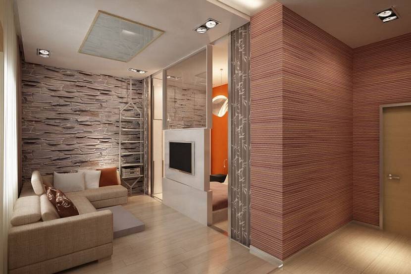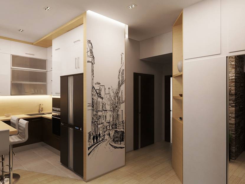 Небольшое замкнутое пространство невыгодно выглядит с точки зрения эстетического, визуального восприятия. Снос перегородки или максимальное расширение, а также демонтаж дверного проёма позволят раздвинуть площадь. Исчезнет эффект замкнутого пространства, появится возможность разместить больше мебели. Зонировать комнаты помогут открытые полки с подсветкой. В большинстве «хрущёвок» прихожая настолько маленькая, что нет возможности поставить полноценный шкаф-купе глубиной 60 см, даже 40-45 см. Выходом станет угловой шкаф со скошенными угловыми сегментами для удобства передвижения. Вместо снесённой перегородки можно установить одну из мебельных секций.