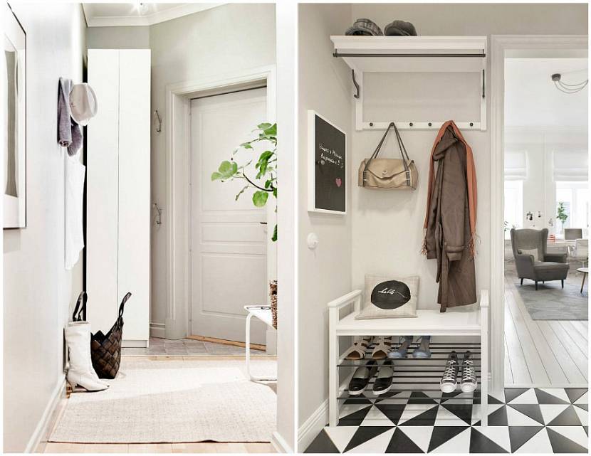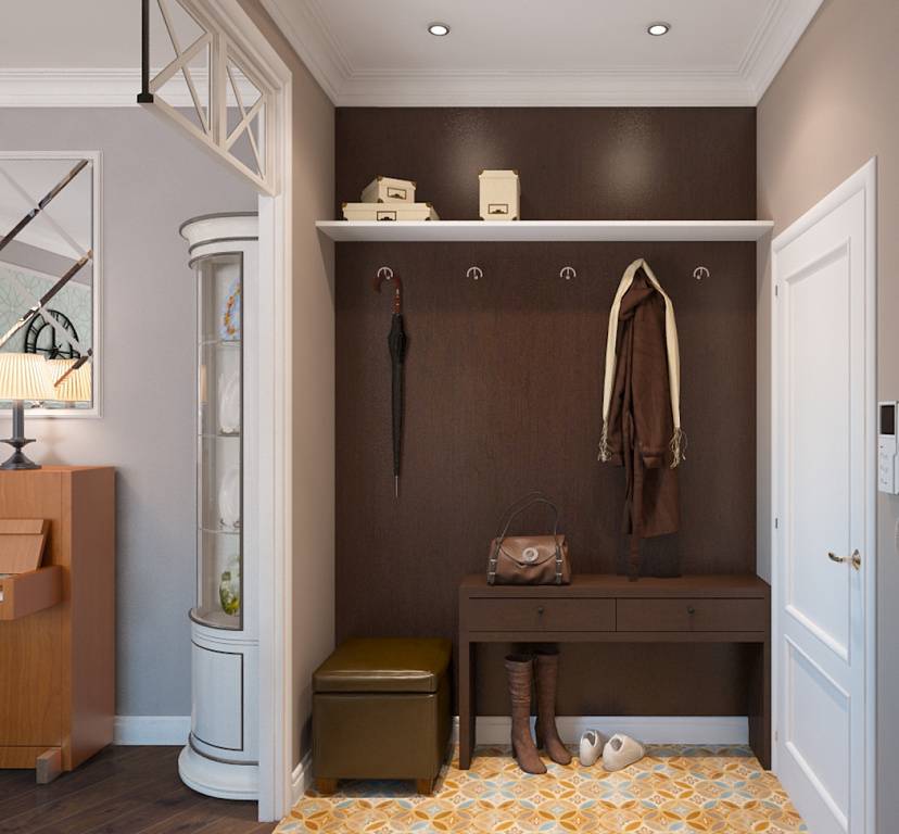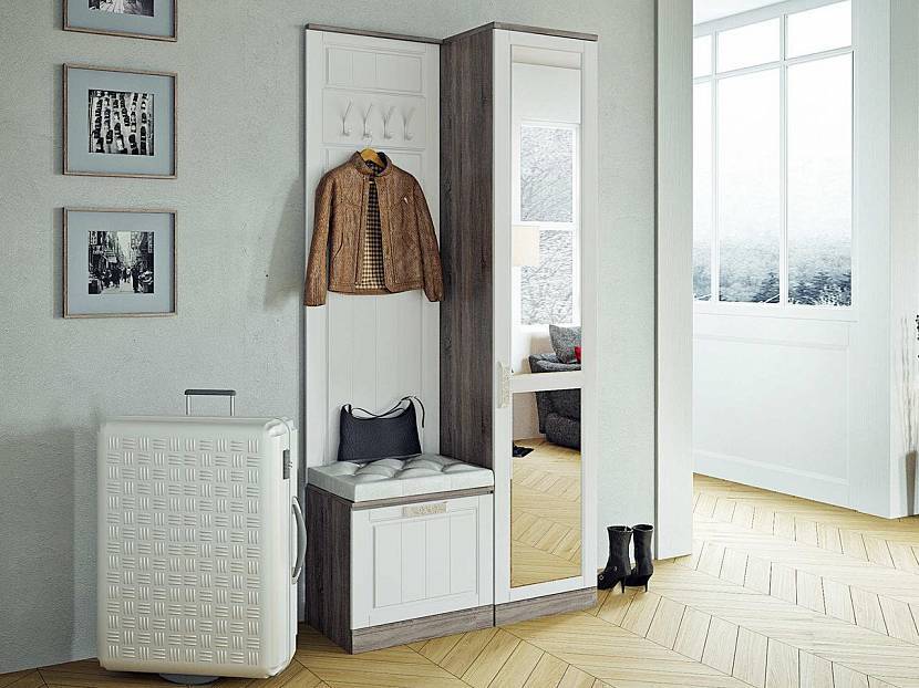Бывает, что и этот скромный набор не вмещается, и тогда приходится обходиться вообще вешалкой или набором крючков, небольшой полочкой и зеркалом