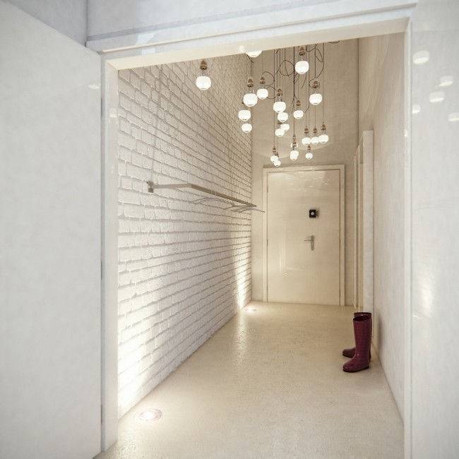 - Грамотное освещение. Чаще всего в прихожих окон нет совсем или они слишком маленькие для подачи необходимого количества света. В связи с этим необходимо грамотно расположить точечные светильники или вмонтировать в стены бра с рассеивающим светом, разделив всю территорию на конкретные зоны.