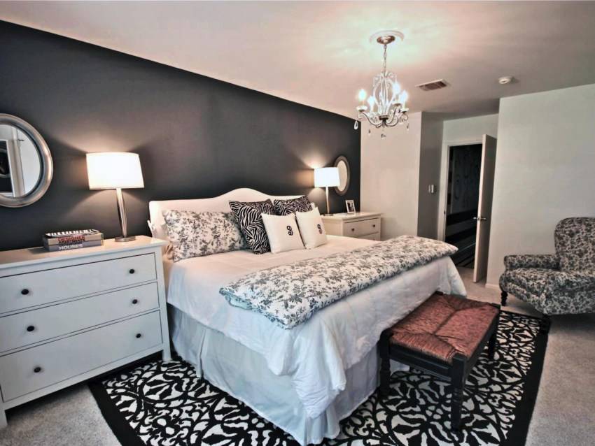 Проще всего выбрать фоновые обои требуемого оттенка. На белом фоне хорошо смотрится деревянная кровать или ковка. Темный фон прекрасно оттенит светлую мебель. Подумайте над этим, перед тем как оформить стену над кроватью – ювелирные изделия подают на черном бархате, тот же принцип можно использовать в интерьере.