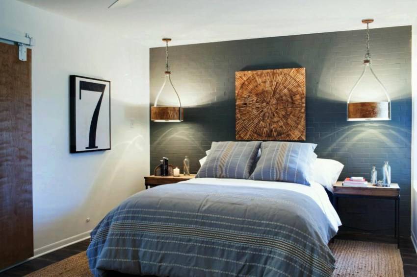 Эпатажностью, диссоназмом отличается стиль лофт. Он подходит для небольшой спальни. Отделывают поверхности в виде кирпичной кладки, безотделочной штукатурки, бетонной поверхности.