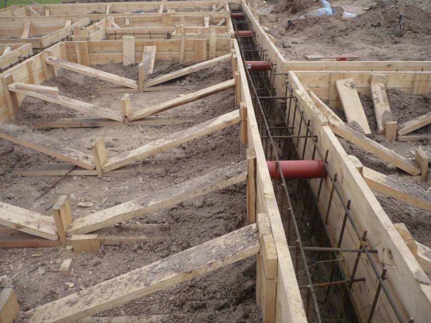 Раскосы и упоры выполняют из любой древесной породы. Есть одна тонкость, которую необходимо учесть при заливке фундаментов большой глубины: деревянные распорки придется ставить внутри фундамента. Древесину оставлять в теле фундамента не рекомендуется, так как со временем она будет перегнивать и получатся сквозные пустоты через весь фундамент.
