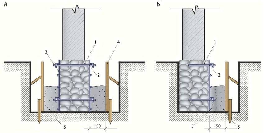 Схема двустороннего (А) и одностороннего (Б) укрепления фундамента: 1 — бутовый фундамент, 2 — анкер, 3 — арматурная сетка, 4 — опалубка, 5 — бетонная смесь