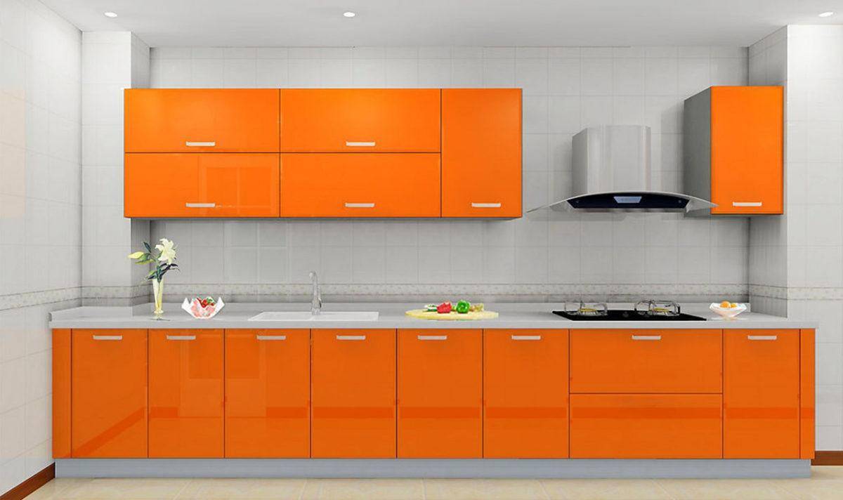 Чаще всего оранжевые кухни глянцевые: МДФ в качестве основы, покрытие – эмаль с эффектом высокий глянец либо акрил, пластик HPL, пленка ПВХ.