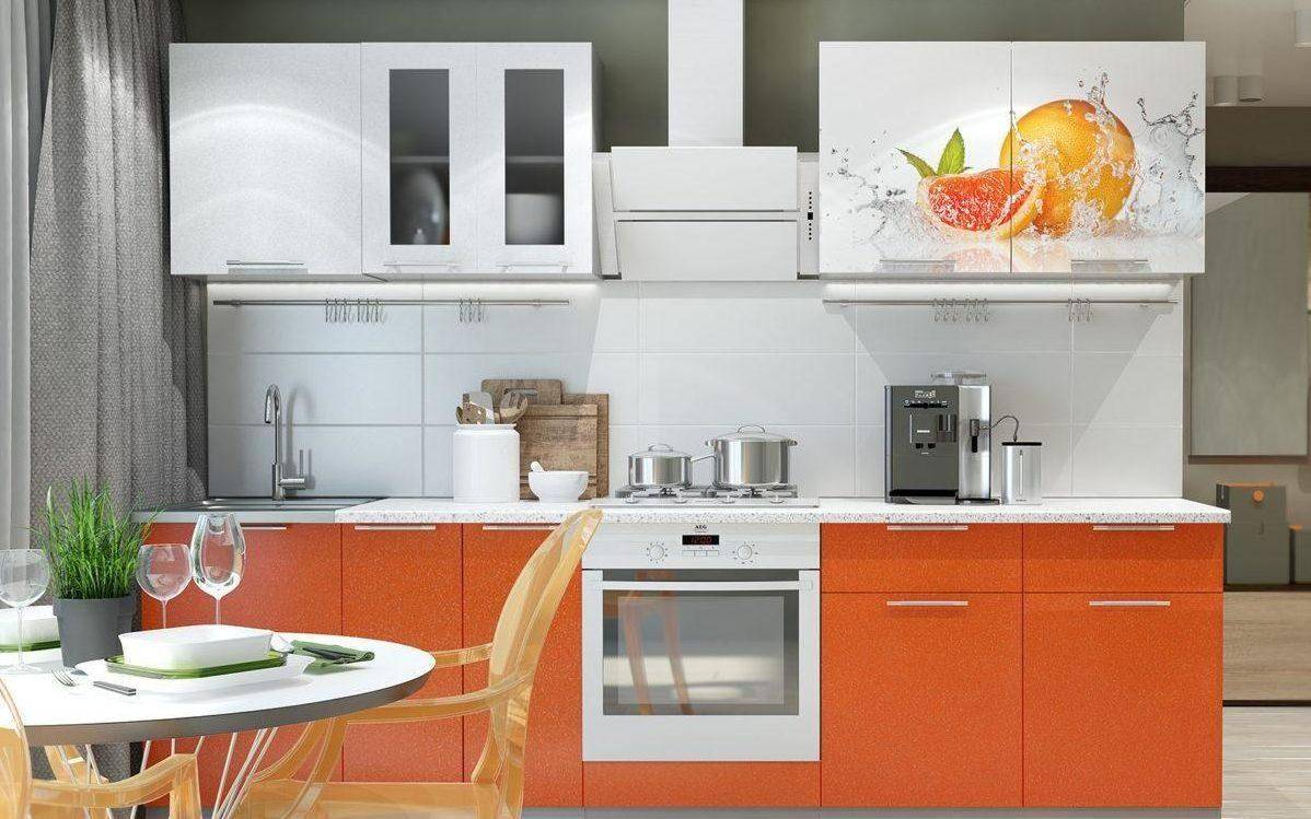 Можно сделать фасады в сером или белом цвете, например, а рабочую зону в виде островка в центре кухни в оранжевом цвете.