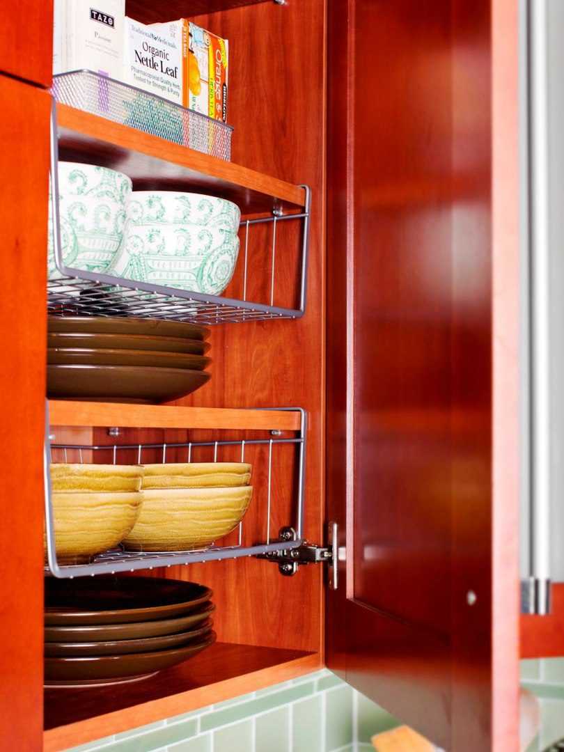 Все принадлежности, которые используются реже, лучше убрать поглубже в шкаф. Если вы достаёте что-то крайне редко, то рекомендуется освободить место, убрав его подальше. Кухонные принадлежности, которыми вы вообще не пользуетесь и не собираетесь это делать, отдайте кому-нибудь.