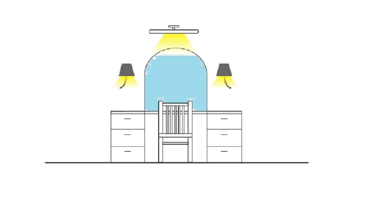 зеркало и прилежащая область может освещаться сверху или по бокам, но, ни в коем случае не стоит направлять свет в отражающую поверхность, иначе он будет вас слепить.