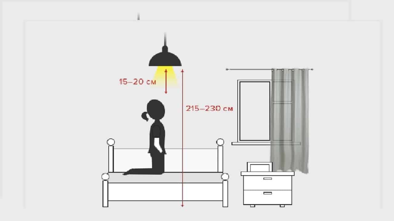 для потолочного светильника – 215 – 230 см от пола, но здесь важно учитывать рост человека, который будет спать или отдыхать на кровати;