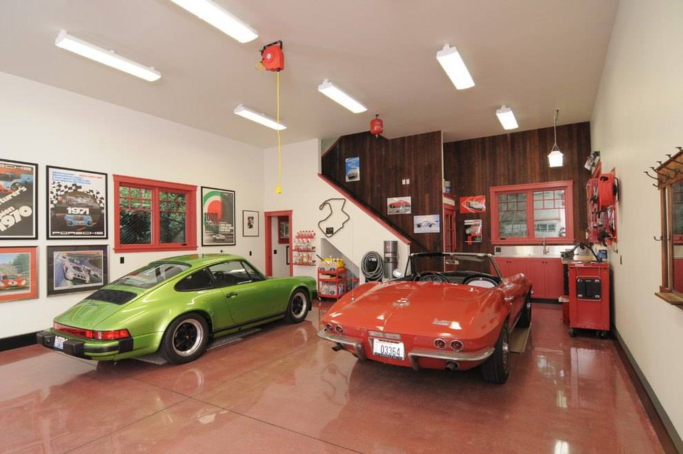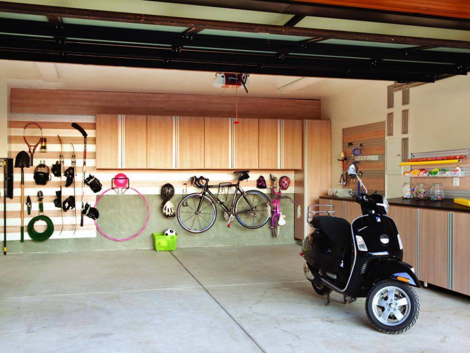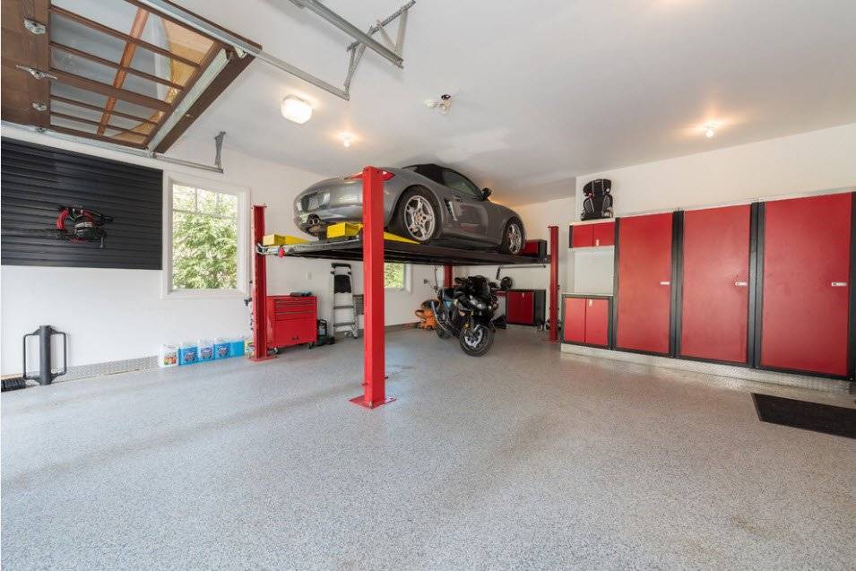 Вы не ошибетесь, если остановите свой выбор на отделке помещения в приятных синих тонах или с контурами геометрических фигур на стенах. Также неплохо выглядит и гараж с переходами цвета – из темного в светлый, и наоборот. Если говорить в целом, то внутреннее обустройство гаража условно разделяется на 3 этапа: