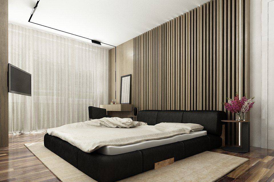 Различные деревянные конструкции довольно часто используются для дизайна спален. Классический способ — отделать рейками стену за изголовьем кровати.