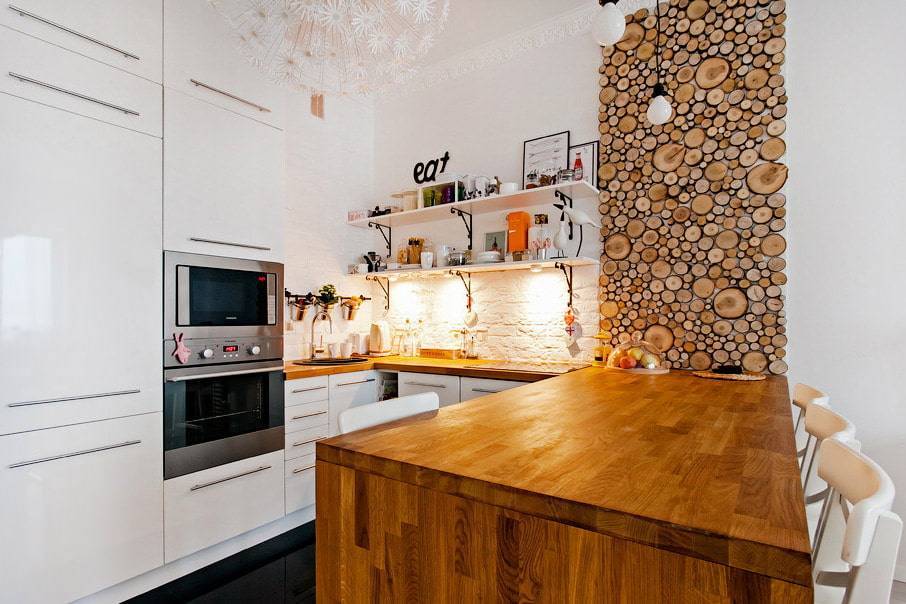 На фото стена из спилов в гостиной. Натуральное дерево способствует расслаблению, кроме того приятно пахнет и долго хранит аромат эфирных масел.